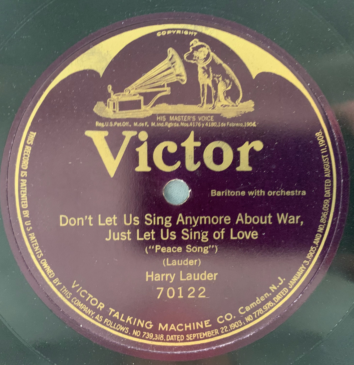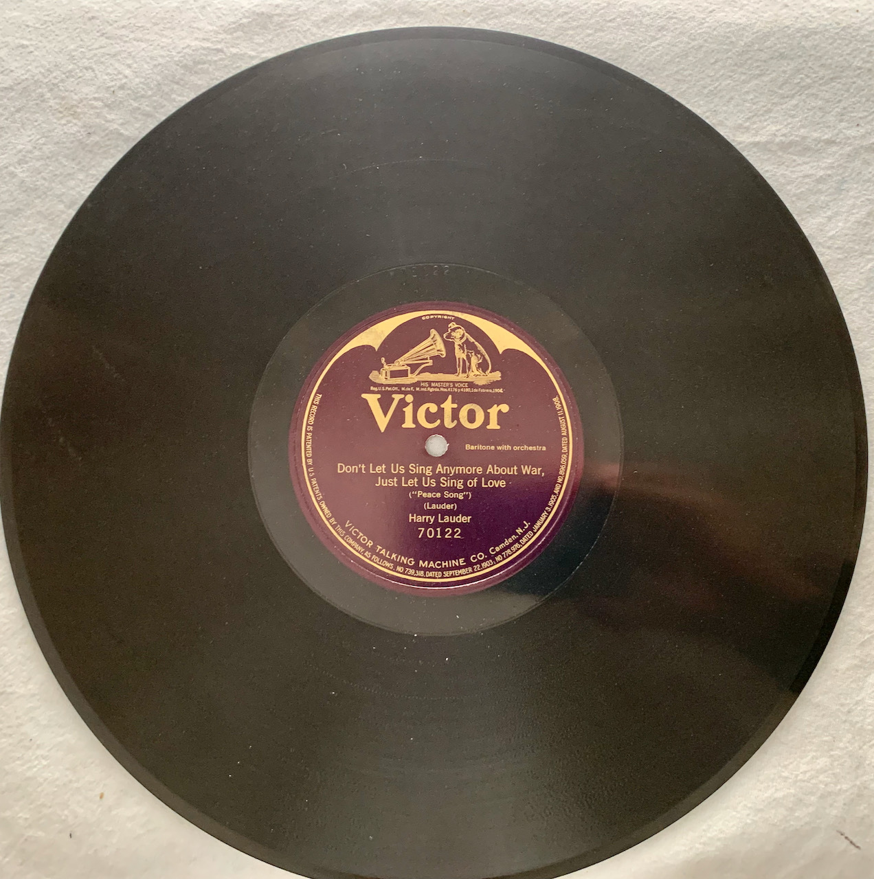 Here is a 1921 one sided 78rpm 12 inch Victor Harry Lauder record. "Don't Lets sing anymore about war, just let us sing of love. Excellent condition.