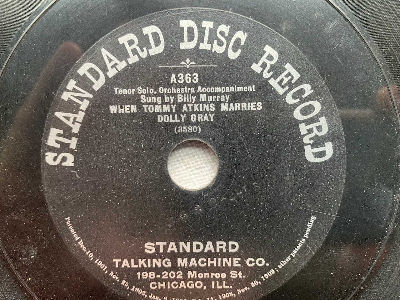 Here is a 1906 Standard label 78rpm record. Billy Murray "WhenTommy Atkins Marries Dolly Gray" / "A Call to Arms".This record is in VG+ Condition.Note : Standard records have an enlarged Post Hole.