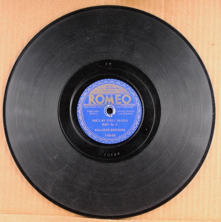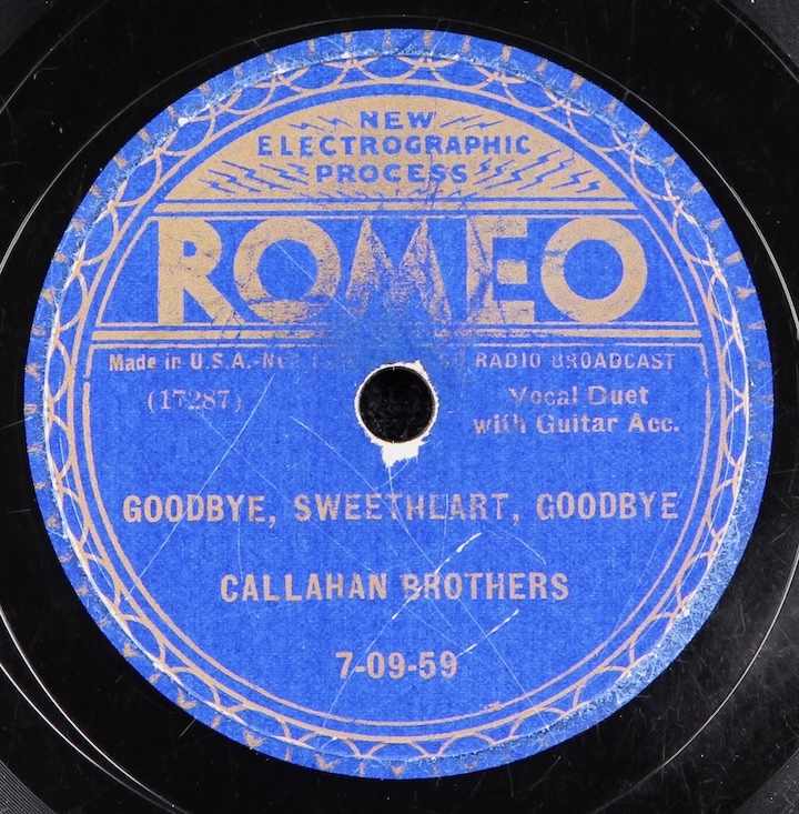 Popular North Carolina hillbilly brothers duet, Walter and Homer Callahan. "Goodbye..." plays ok but moderately noisy surface throughout and "Curly Headed Baby" noisier yet.
